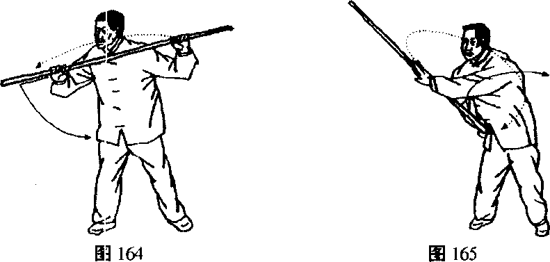 1. 右转腰,右手持棍在前上举使棍端走上弧向西捣去与肩 平,成右弓步,再右转腰,右手外滑向下停于右腰旁,左手棍随 之向西南方向打去。(图164、165)
