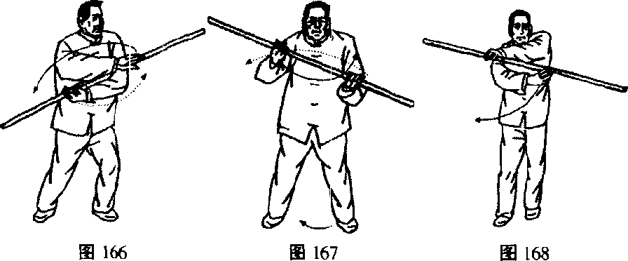 2. 左转腰,左手棍外滑向下停于右腰前,右手棍则随之向 东南打去,双手形成交叉把。(右手持棍在前,左手在后)左弓 步。(图166)