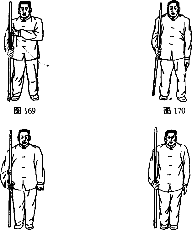 1. 右手持棍向右下垂,竖棍于右足旁2寸许,左手随之离 棍,手心向外,向左下落于左胯旁。(图169、170)