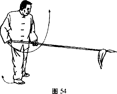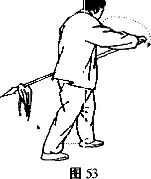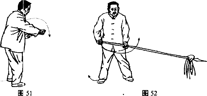 1. 左转腰,双手持枪向左下(西北方向)顺抡,同时后撤 右足。目随之。(图51)