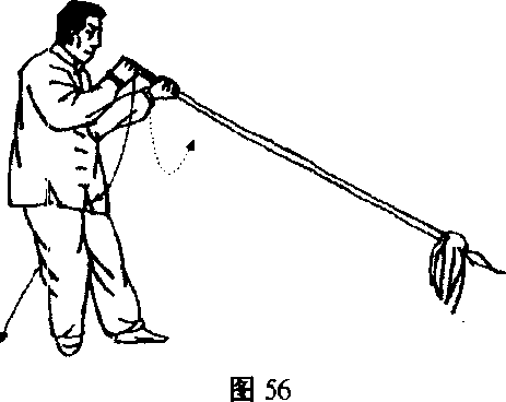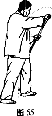 2. 紧接上动抡枪不停,向下抡至东北方向,双手托枪至面 前,枪尖向下成斜坡状同时左足变虚步。(图56)