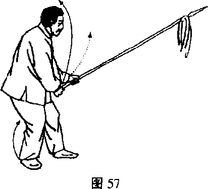 3. 蹲身下坐,重心落于右腿,右足尖点地,同时右手向右 下抽枪,左手则猛然随坐腕上崩,虎口向上,发出惊弹之力。目 随之。(图57)