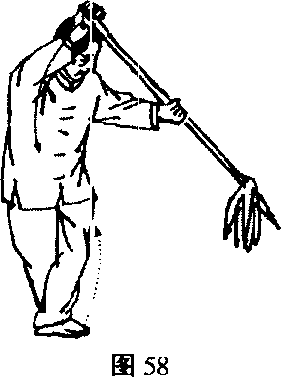 1. 右足向左足后倒叉,同时向左下双手抖枪,右手提枪至 右额前,左手在下走下提枪。(图58)
