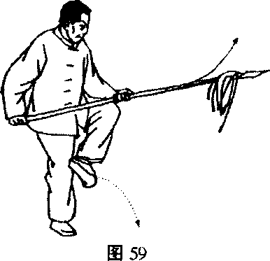2. 抬起左足成右独立步,同时左双手里扣走拿枪。(图59)