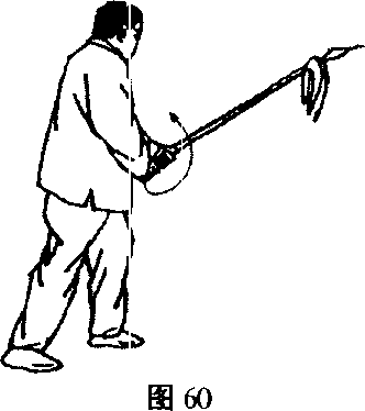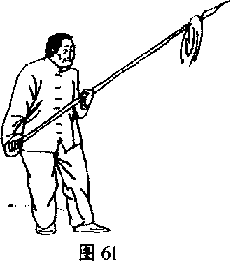 双手持枪用腰脊之力向左一摆,如牛之转角,右手阳握,左 肘贴肋,左腕转至乳,自阳而更转至手背向天。左手持枪在左 上,右手则持枪在右下,成抱琵琶状;与此同时重心移于右腿, 左足跟抬起成左虚步。目随之。(图61)