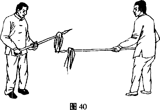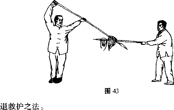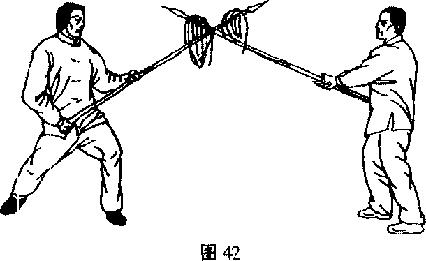 (2) 甲,苍龙掉尾后撤右足成左弓步,左转腰拦出乙第一 枪;紧接着再后撤右足,退左足与右足并齐,同时右手提枪至右 额旁,左手在下托枪,枪身成斜坡状,挡住乙第二枪。(图42、 43)