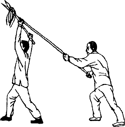 (3) 甲,背抨蹲身下坐,出右足成盖步,同时双手向上 托枪过顶,搪住乙枪。(图45)