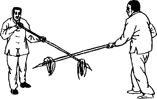 (3) 甲,青龙出水落实右足,抬起左足,前落左足成左弓 步,同时向乙圈里出上枪扎其面3 (图57)