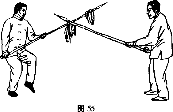 之下落,同时蹲身下坐成左虚步,右手持枪向右下沉枪,左手则 坐腕上崩,将乙枪防出。(图55:)