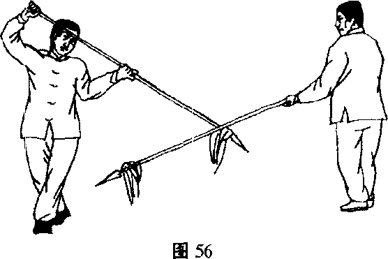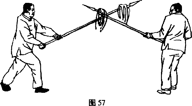 (4) 乙,翻身捉枪上右足成右弓步,同时双手持枪,以腰带 动由左下向右上抡,犹如鹰捉猎物之势,将甲枪捉住。(图57)