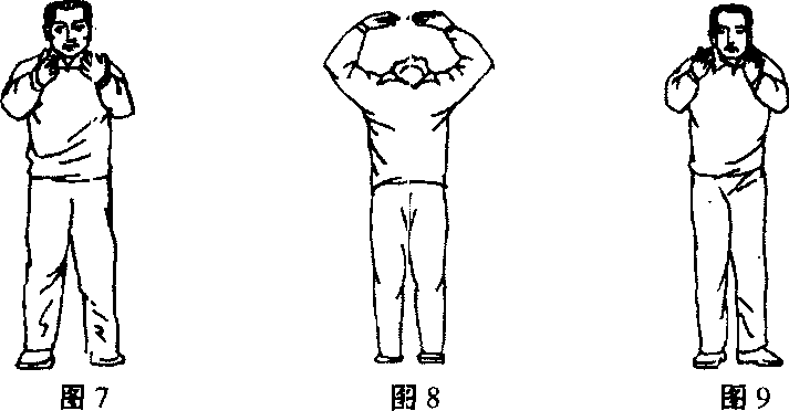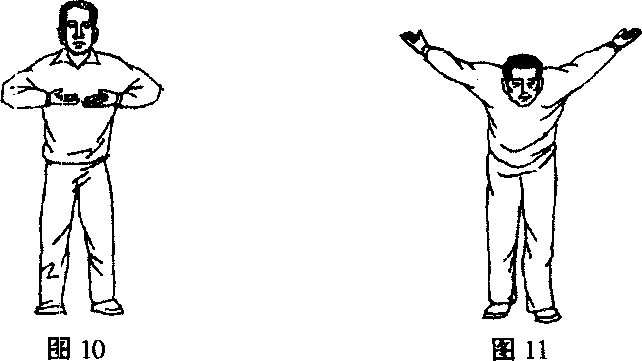 至双臂前伸,双手手心相向(图9);而后双臂向左右绷开,双 肘扇起,双手手心变向上,身向前倾(图10);随之向前弯腰90 度,同时双臂以肘为轴向里向后再向上伸,如跳水的预备势(图 11);接着双臂向外向前伸平,双手手心相对。如此做4次。