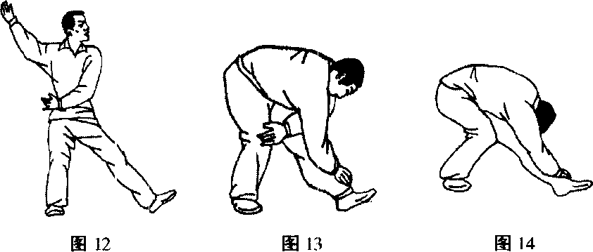 身向左转,左足向左前循弧线踏出半步,足尖抬起(不超过 45度);左手屈臂伸向右腋下,手心向下;右臂向后上伸,手心 斜向前(图12);而后身向前弯,左手手心扣住右膝,左肘压住 左膝;右手以肩为轴转向下,按压左足尖3次,左手、肘不动 (图13);而后左手前伸,按压左足,右手按在左手手背上,左 足尖仍然不动,再按压3次,头随之而动(图14)。此为左势。 随之身向右转,右足向右前弧形踏出半步,余同左势,唯方向相 反,为右势。