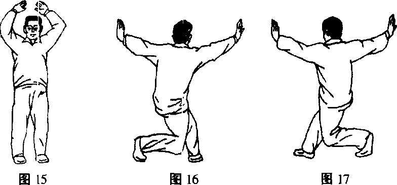 面向南,小开步,双足足尖向前,双手向胸前交叉,右手在 左手前,双手手心向后;随后双手缓缓上升,变手心向外,并逐 渐分开至十指相对(图15);而后,身向左转,左足足跟为轴向 外撇,右足足掌为轴足跟外摆,向身后(北)转,右膝插于左腓 左侧前,右足跟抬起,左腿屈90度,身直勿前倾;同时双臂向 两侧平伸,手掌向上竖起(图16);而后,仍以右足跟和左足掌 为轴转回至面向南,同时双手在胸前交叉上举;而后,身向右 转,右足足跟为轴向外撇,左足掌为轴向身后(北)转,余同左 势,唯方向相反(图17)。如此,起落各4次。
