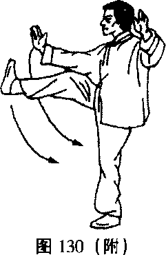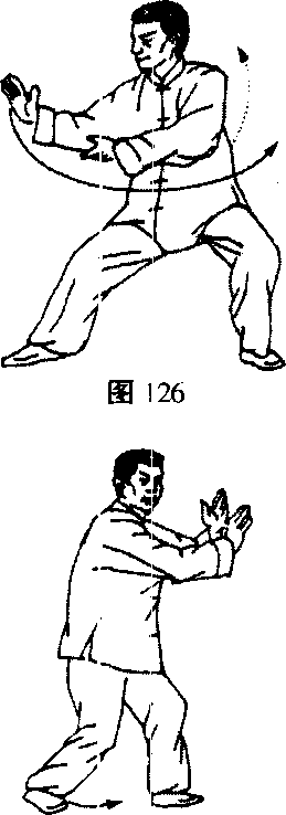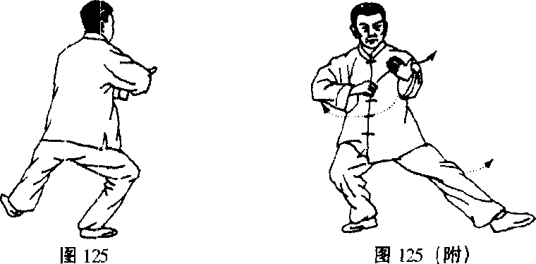 腿,放开左脚,脚掌略外撇并脚尖向上,高不过45度,三者同 时完成。(图125)