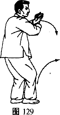 向外、向里顺划弧线,屈膝虚悬,同时双掌向外、向下棚挂于右 膝两旁,手心均向后,似双手提篮之状。(图131)接着双掌继