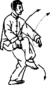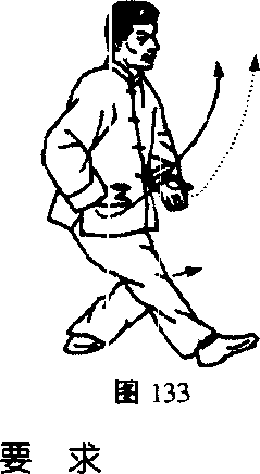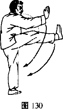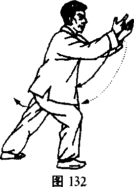 图131续由外向里划弧从胯间斜向东南上方,以手背向下棚击。在双手 向上出时,右足随之徐徐向前下落,先足跟着地,再前弓变右弓 势。(图132)