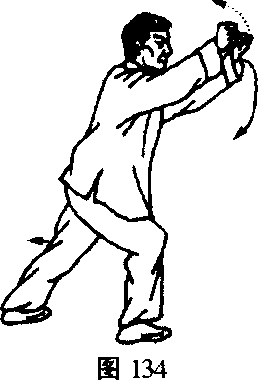 2. 贯耳:双手随身后坐循去路返回,即棚击后由胸前向下 停于两胯旁,手心均向上,步型为右太极势。(图133)接着身 向前拥,双掌分别以腕为轴向里、向后、向外再向上、向前与眼 齐高时变拳,拳眼相向夹击。两肘下垂,似螳螂捕蝉之势;右腿 随双拳前击渐变右弓势。目前视。(图134)