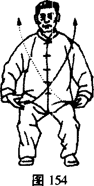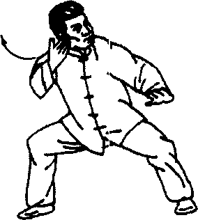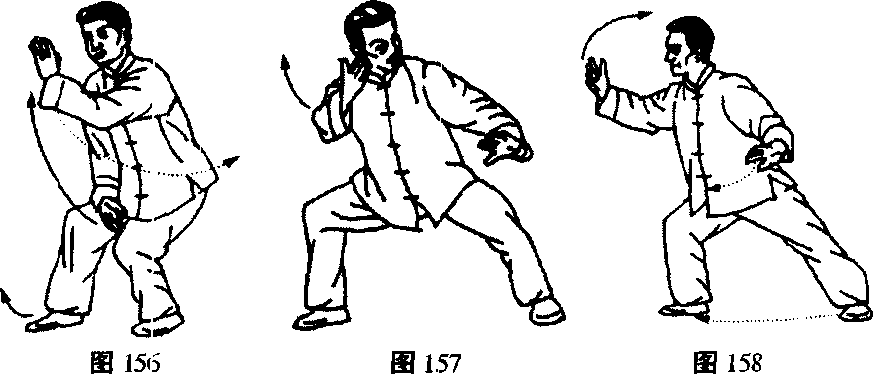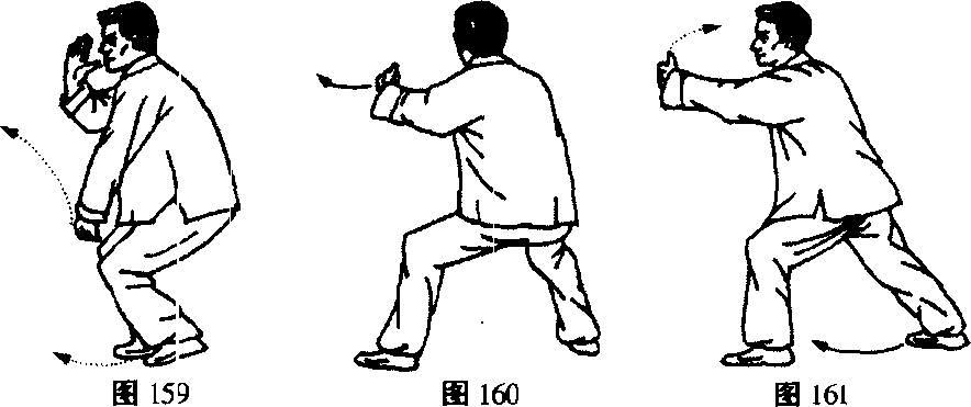3. 右、左、右三势要连起来做。此势主要锻炼前进时腰部 的转换,亦即两肾的抽托以及上下肢的相互配合。