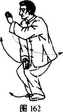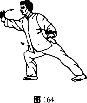 3. 其三,右势:与其一相同,但起手应参见左势。先松腰 松胯,含胞拔背。左足尖外撇,右手向左,停于左胯前;左手向 右停于右肩前。余见右势。(图162~ 164)