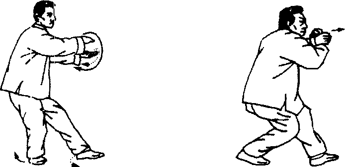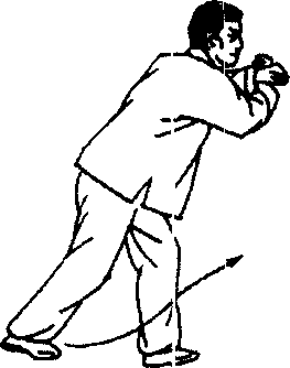 2. 本势起手时,向西北斜身后亦可横右小臂向左移,左奉 变仰掌前伸至右拳之下;左足跟悬空前蹬,再小脚趾着地。左足 跟悬空前燈时透过右跪前窥,以显示功夫。