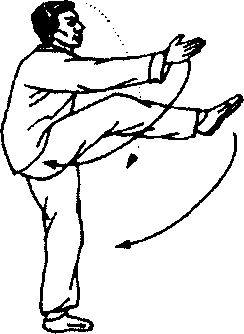 1. 本势踢脚也要求支重腿站稳,要注意到四点:①周身放 松,勿用拙力。②双肩下沉,犹如建筑方面的大屋顶,借铅垂压 力使墙、桩四平八稳。③要找出水平视线的目标,起到平衡器的 作用。④锻炜腿力。腿力有赖于肌筋负荷运动。太极拳的屈腿运 行即是很好的锻炼方法,但要注意盘架子时保持一定高度,而且