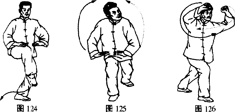 1.双采双按:周身松沉、含胸,略屈左腿,身下降,右小 腿下挂。同时双手里拧腕部变俯掌向下采,两手在胸前会合,食 指相对,双臂近平圆形。(图124)接着以左足跟为轴,身略向 右转,右足向南前伸,猫行步落地,缓缓弓膝成“右迭裆弓势”。 同时双掌徐徐下按到右膝前,双臂棚开,合成一个坡圆形,身向 东南,偏头看正东远处^ (图125)