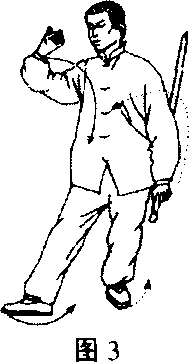 之四,右转上榻腰向左转,含胸,左手臂平棚,右手向左 下伸成合抱之势;腰再向右转,以左足掌、右足跟为轴成右太极 式,同时双臂环抱胸前,接着执剑手循右小臂里侧徐徐下沉至左 腿外侧(剑谭向下),右手则循左小臂外侧上棚齐眉,手心向里, 五指向南。终了势身向西偏南,目光透过食指远视。(图3)