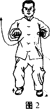 之三,前棚下沉右手五指下落似有入地三尺之意,其后双 臂以意引之,徐徐向前提起与肩平齐,接着缓缓屈膝下沉至45 度,双臂随之降到胸腹之间,与双足上下相对,上体保持中正, 含胸,拔背,尾闾收住如坐椅上。(图2)