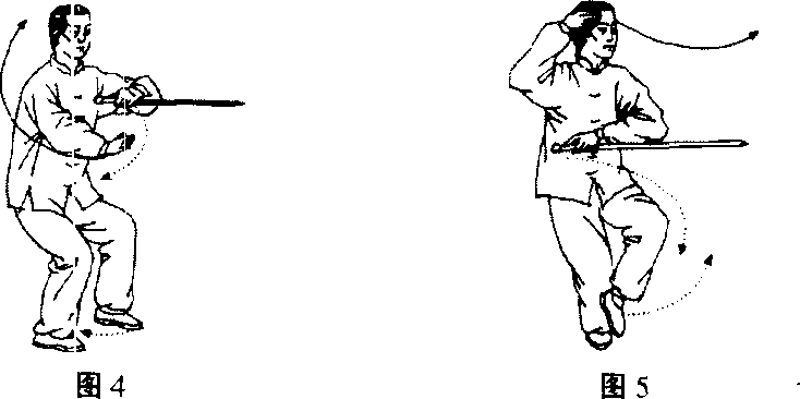 第一环之一,双手反抱随腰左转势,右掌坐腕向南,再垂 腕自鼻前下降到胸前,五指向东,手心向下;同时里扣右足,提 起左足跟成左虚式,执剑手向东南角顺行画圆而上,经鼻前变阴 手剑把到达颈前与锁骨齐高,剑尖向东。此时两手左上右下形成 反抱之势,目视南方。(图4)