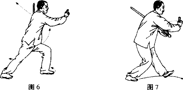 第一环之三,坐腕前指左足向东迈出,先以足跟着地,渐 渐踏实成左弓式;同时执剑手绕过左膝停于左腿外侧,剑镡朝 地,右掌则从右耳旁向东推,边推边捏散指到戟指,坐腕,手心 朝东与肩齐高,三尖对正(即食指尖、鼻尖、太趾尖三者在一条 线上,下同),同时到点,目光经食指延伸及远。(图6)