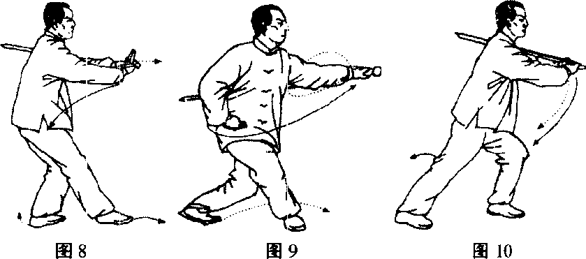 第二环之二,双腕交叉左足尖下落左膝前弓,向东提右足 向前成低架右虚式;同时右转腰,提剑把穿过右腕上方,剑镡指 向东南方与右腕交叉成平面斜十字形,两臂棚开成圆形,身向正 东,目视东方。(图8)
