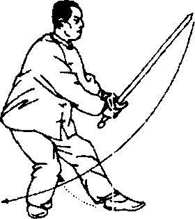 1. 剑尖行圈要在一条线上,如本势剑尖的走向是立圈,要 自东向下往西再翻腕向上归到东面,如同画太阳一样,不能弯弯 曲曲。要在身腰和手腕上下功夫。