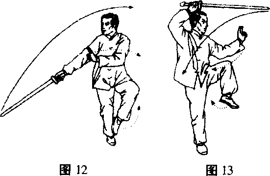 之二,同首视剑右转腰,右手剑继续顺流而下,经右小腿 使剑身与右臂成斜坡直线时,随即翻腕顺转,由逆手剑把变成顺 手剑把,手心向南;同时左戟指随之贴于右臂内侧的中部戟指朝 天,掌心向西,收回左足驻于右踝骨内侧之前,足尖下垂,右腿 屈蹲成寒鸡式,裆须圆撑,回头视剑。(图12)