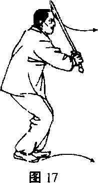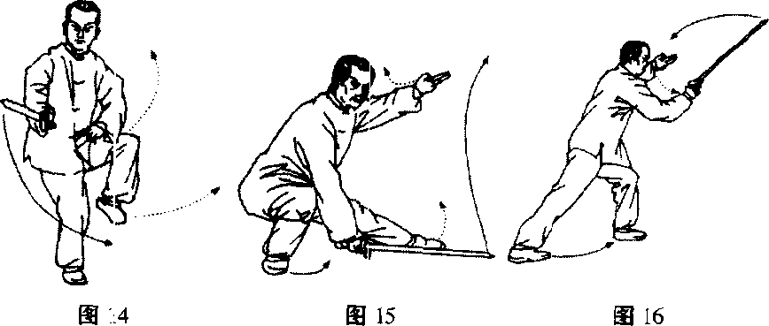 之一,向左闪身眼向右看,右腿渐渐下蹲,戟指领,持剑 腕随行,相距半尺余,剑由右额向右下,外手剑变为顺手剑,剑 尖向南与膝齐高,左足形成踢毯子的腿形,置于右膝内侧成半独 立粧形,目视剑尖。(图14)