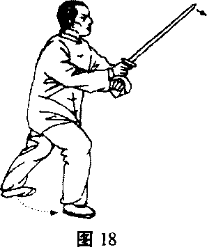 之一,左格右击左转腰,迭胯沉裆,用阳手剑向左一格, 随即变阴手剑踉上右足暂驻在左踝骨内成寒鸡式;同时下落戟指 扶于右腕内侧。(图17)紧接着向东南上右足成右弓式,以剑身 斜带对方,剑把齐胸,剑尖向东北,高过头部;戟指仍助右腕推 进。(图18)