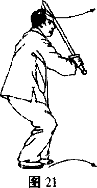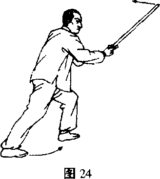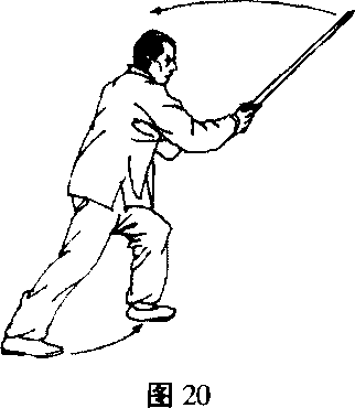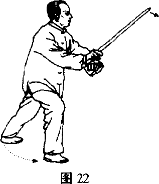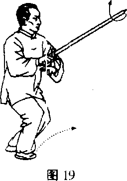 之二,右格左击右转腰,迭胯沉裆,用阴手剑向右一格, 随即变阳手剑,上左足暂驻于右踝骨内侧。(图19)紧接着向东 北角上左足成左弓式,用阳手剑以剑身斜抽其头部,戟指在剑镡 * 238 ?