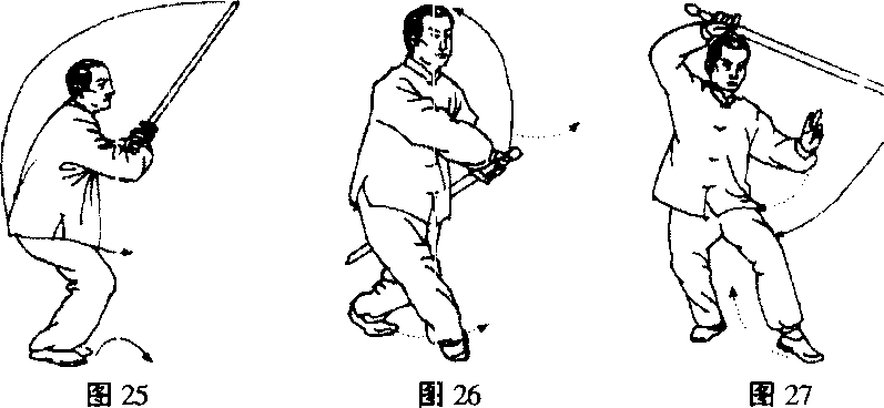 之二,缠绕来械持剑手以肘为轴挽一逆行剑圈,即剑由t 向左后缠绕使剑身成前高后低之状;同时左戟指附于右腕助力, 两腋棚起;接着右转腰,上右足向东南角,先以足跟着地,再外 撇右足尖向有踏实,左足跟在原地提起成右高架坐盘式。沉肩、 含胸,目视对方,作蓄势待发。(图26)