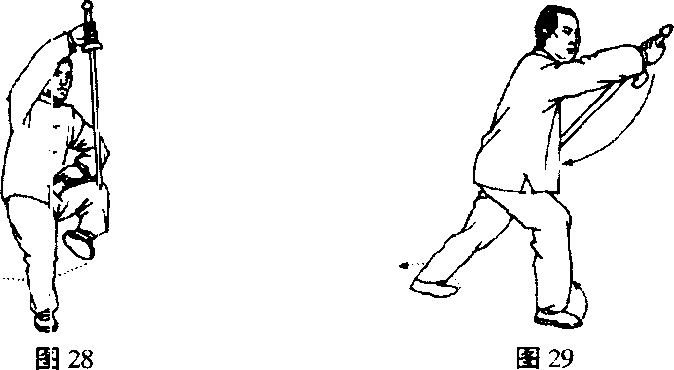 之一,覆蔽要害右腿仍弯曲不动,提左足掌靠近右膝内侧 成右独立式;轻舒剑把使剑刃对准鼻梁;左戟指变手心向上,向 里环绕置于腹前。目视东南角作转身的准备。(图28)