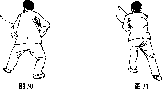 为轴,乘后转之势成为面向西北,步型为左弓马式;同时左肘顺 转带动戟指翻转变掌心向上,虎口向前,剑把则里裹到右腰旁变 阳手剑,剑尖针对西北上方。眼神注视对方。(图30)