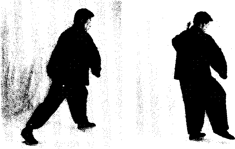 动作1:身体重心不变,左脚尖外撇45度,腰身渐渐左转, 左脚踏实。继而左胯微内收下沉,右脚跟离地,使身体重心渐渐 前移于左脚。同时,右掌微向左下弧形移动,边移边由掌变拳, 移至腹前使拳心朝下。左掌也随转体向左后移,手臂略外旋,使 掌心微朝里下。眼神顾及右手下移,头部仍须正直(图54)。