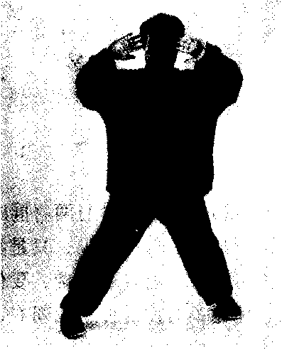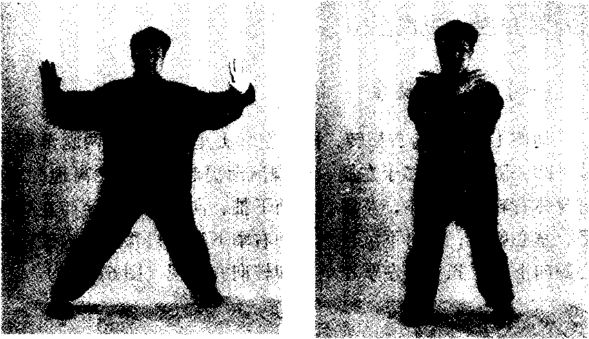 (3) 两膝屈蹲时,身体不可趴下,身体立起时,不可后仰。 注意做到劲贯足跟,虚灵顶劲,收住尾闾,松腰拔背,整个十字 手动作,务要做得圆活松净,立身安舒,上下相随,柔中寓刚。