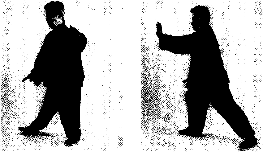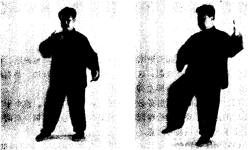 动作2:与前第3势“揽雀尾”(二)撮势动作2相同,唯方 向不同,前揽雀尾的弓步、虚步是朝着正西方,此动作以及后面 挤、按各动作是朝西北斜方进行的(图72)。