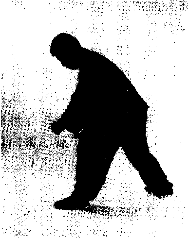(1) 当左脚前迈脚跟尚未着地时,上体应注意保持正直;当 左掌搂过左膝时,上体随右拳下打折腰,拳到势到。折腰时,自 颈脊到腰脊仍要保持成直线,不可弓背、低头或抬头。