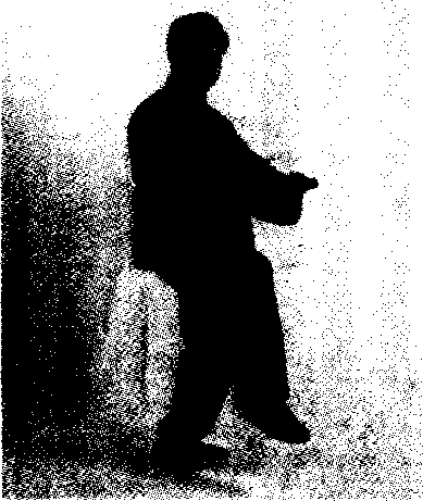 动作1:左脚以脚掌为轴,脚跟里磨踏实,身体渐渐左转, 重心随着左移;同时,左拳随转体向左平移,右拳向右弧形下移 (此时两拳已开始松开);眼随转体平视转移(图208)。