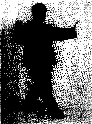动作2:两掌向左右分开;同时,左脚以脚跟慢慢向左蹬 出,右腿随左脚蹬出渐渐起立,膝仍微屈。眼神关顾左掌分开, 并通过左掌向前平视(图216)0