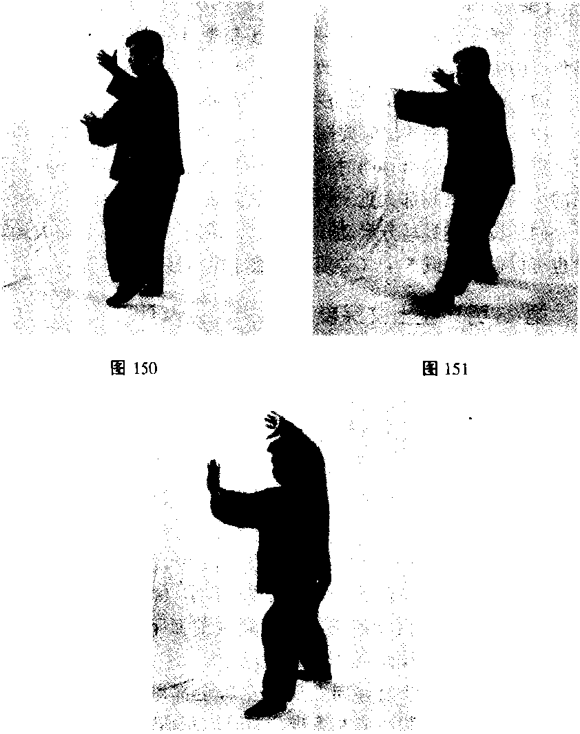 动作1:身体继续右转,左脚经右踝侧向前提起。随转体, 左掌经腹前向右弧形移至右小臂下侧;右掌也随转体继续稍右 II,即沉右肘,自然带动右掌向下移回。眼稍关右掌后移,即转 向前平视(图150) 0