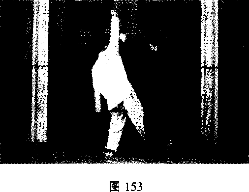 乙自右前斜方打拳,甲速换势,左足向前一步;左手架乙 臂,右掌对乙打去,右足在后蹬直(图153)0