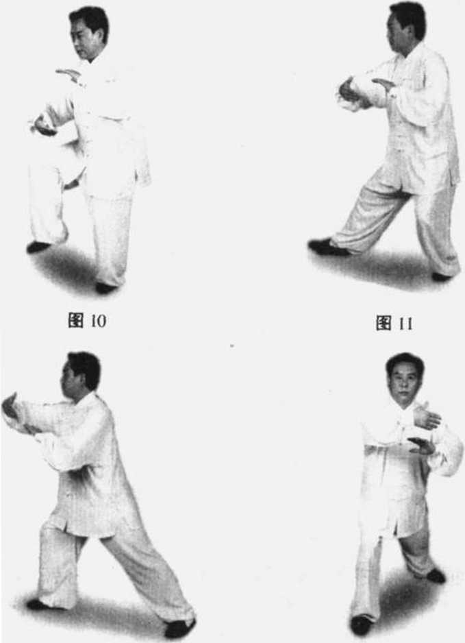 2. 右脚向正西迈出一步,先以脚跟着地,随着重心前移而 全脚踏实,右腿弓,左腿蹬成右弓步势。同时右小臂由下向前上 糊,掌心朝内,高与胸平,左掌随右臂略向下向前推送,掌心朝 前下,两手腕部前后距离约一肘为度。眼神先顾及两手左侧抱 球,再随右棚前视(图11、12,附图12正面图)。