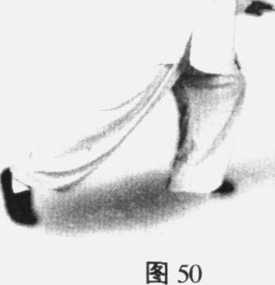 动作:重心稍前移,右脚轻提向前一脚许落下,随后重心移于右 腿,左脚稍起距原地向前一脚许落下,脚跟着地,脚尖微翘成左 虚步势。同时,右手先稍前松送,随重心后移向右胸前下回采, 臂外旋使掌心朝左,左掌由下向前上弧形上举,臂外旋使掌心朝 右,高与眼眉齐,两手如抱琵琶状,此时右手掌心正对左肘。眼 神顾及右掌后撤,随即通过左掌向前平视(图50、51、52)0图51图51图52图52图51图51图52图52要领:重心一前一后的虚实转换要求上体正直,不可前俯或后仰, 两手折叠时要随着松腰拔背两臂微向前送,有意气下沉,劲往前 发之势。