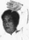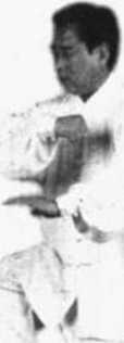 1. 身体直起右转(朝南),左腿重心不变,使脚尖尽量内 扣。随转体,右臂内旋,右肘稍向上向右下微弧形平移至右肋 旁,右手仍握拳横于胸前,拳心朝下。同时左拳自下而上弧形上 举于左额前上方,拳心朝外,眼随转体平视(图120)。